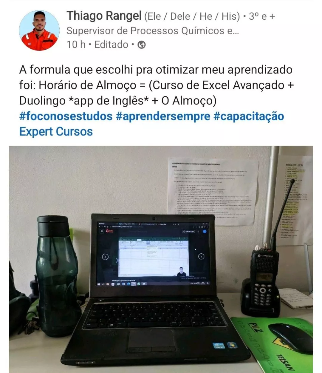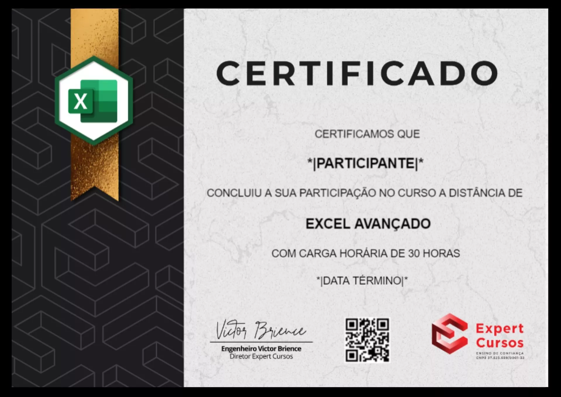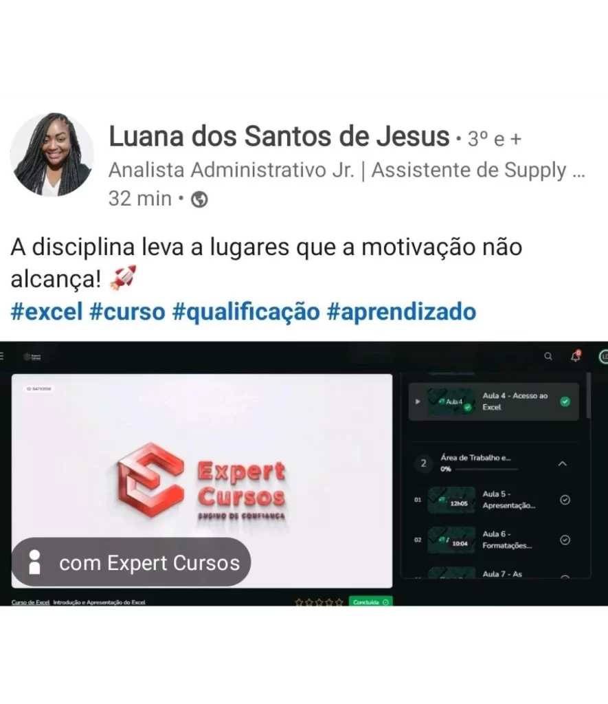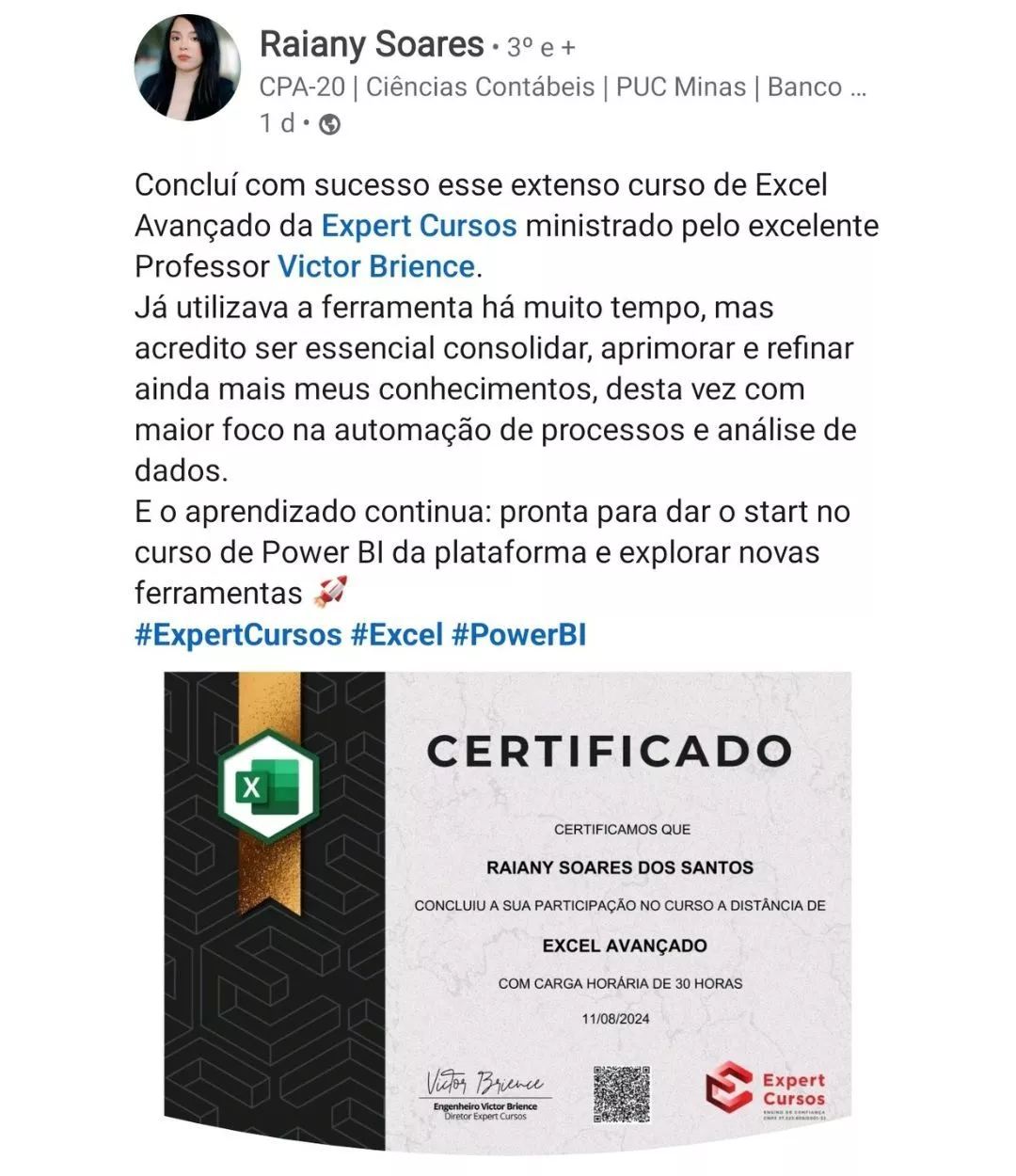 “Recentemente eu terminei o Curso de Excel da Expert Cursos, eu já utilizava o Excel, mas graças ao curso eu pude aprender coisas que eu tinha esquecido e diversas coisas novas. Me sinto muito mais preparado para fazer Planilhas, Tabelas e Dashboards e depois de muito tempo consegui atualizar o meu currículo”.