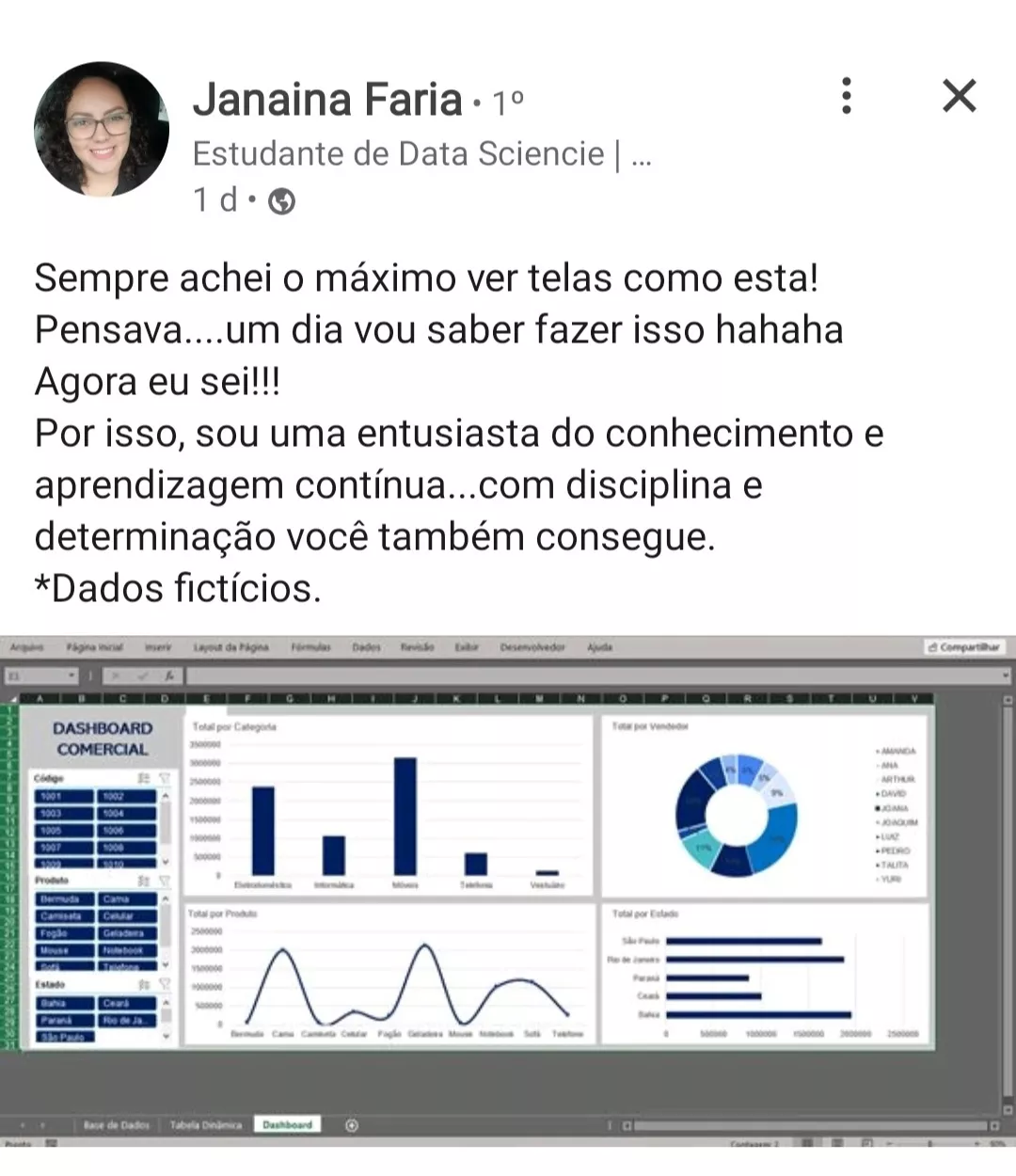 “Eu não tinha noção nenhuma de planilhas e de mexer no Excel e agora depois do curso já estou usando ele todos os dias em meu consultório, seja para a parte de agenda, prontuário e até para os cálculos. A plataforma é maravilhosa e as aulas também são muito fáceis de entender e eu recomendo muito”.